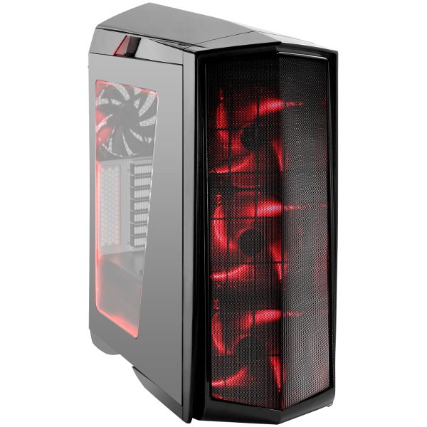 O gabinete conta com ventoinhas retro iluminadas em Led vermelho além de iluminação Led no topo e na base do seu interior.