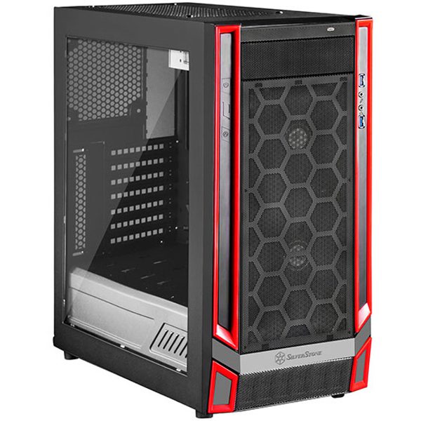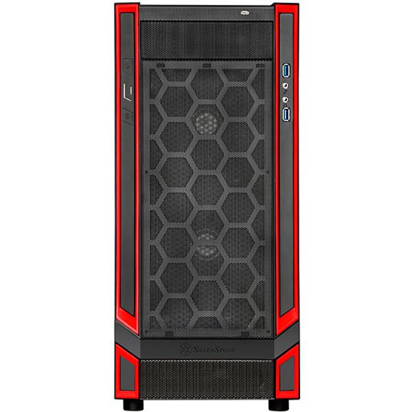 A parte da frente é totalmente coberta por uma tela para passagem de ar e por algumas linhas vermelhas que inspiram o nome desta série de gabinetes. E logo abaixo está o logotipo da Silverstone em baixo relevo.