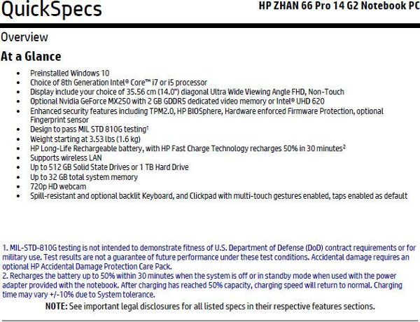 As informações vazadas foram disponibilizadas ao público graças aos detalhes das especificações do notebook HP Zhan 66 Pro 14 G2 Notebook PC, que vai estar equipado com processadores Intel Core i7 ou Core i5 de 8ª geração. O HP Zhan 66 Pro 14 G2 ainda contará com tela Full HD (1.920 x 1.080) de 14 polegadas com ângulos de visão ampliados, porém, sem o recurso de touch screen.