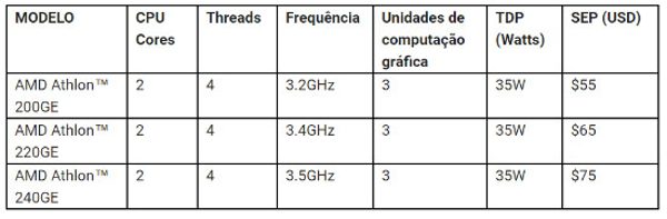 De acordo com a fabricante, a performance gráfica deverá ser até 67% maior em relação aos processadores anteriores da mesma linha, usando como exemplo o Athlon 200GE, que por sinal será o processador mais barato para o consumidor.