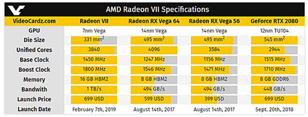 O 1º modelo da 2ª geração de placas de vídeo Vega chega para concorrer diretamente com as placas de vídeo NVIDIA GeForce RTX 2080. A AMD apostou no dobro de capacidade de memória VRAM, sendo 16GB HBM2 e o dobro da largura de banda com 1000GB/s.